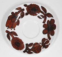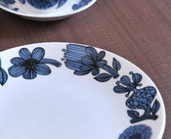 グスタフスベリの復刻版食器です。こちらはアスターと言うキク科の花をモチーフに、花や葉を組み合わせて描かれたもので、1960年に発表されました。アスターシリーズにはブルーとレッドがあり、こちらはブルーのプレートです。 かわ・・・