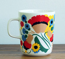 フィンランド語で「小さなダイコンソウ」という意味のpikkukellukka柄のマグカップです。側面を色鮮やかなボタニカル柄が埋め尽くしています。庭で摘んだ花々がモチーフになっていて、赤や黄色の可愛らしい花がテーブルを明・・・