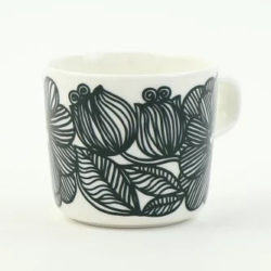 ゼラニウムの花を描いたKurjenpolvi(クルイェンポルヴィ)柄のコーヒーカップです。デザインを手がけたのは、マリメッコの人気デザイナーであるアイノ・マイヤ・メツォラです。大胆な線画で、ゼラニウムの花のほか豊かな花々・・・